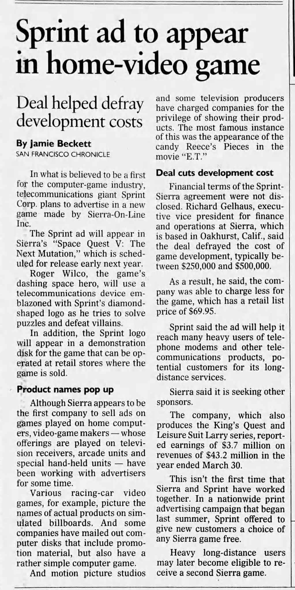 -  Sprint Ad to Appear in Home Video Game (Atlanta Journal, December 1992)
