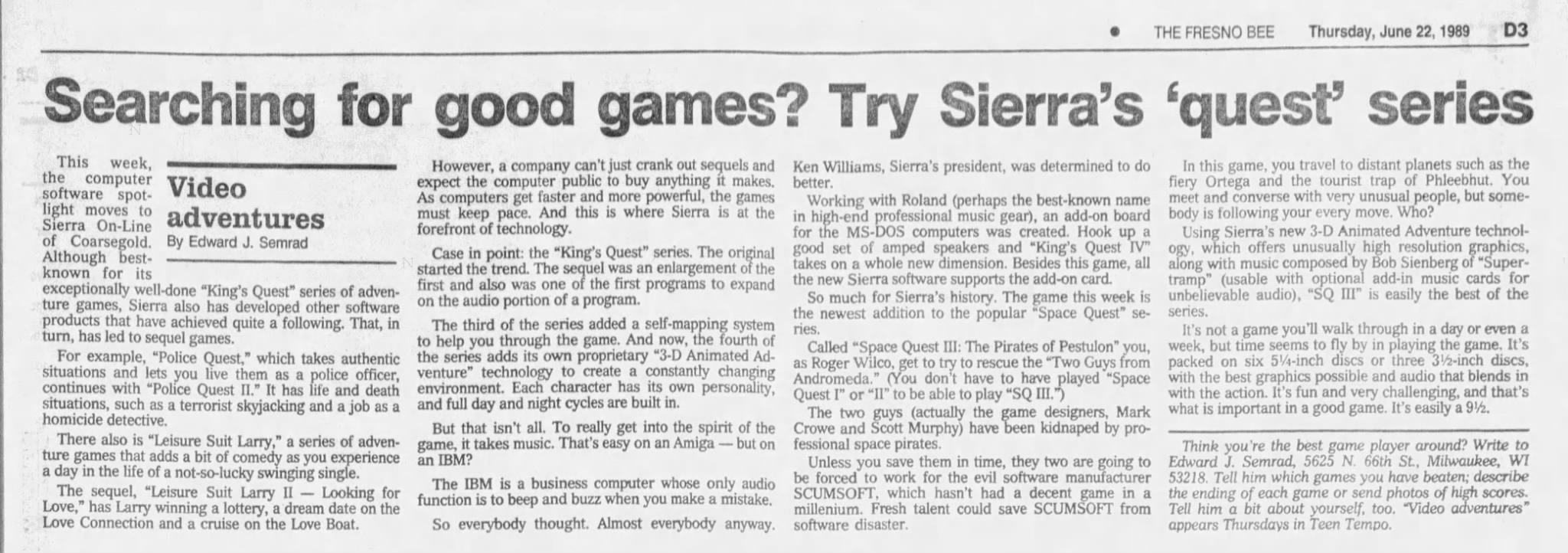 -  Searching for Good Games? Try Sierra's "Quest' Series (The Fresno Bee, June 1989)